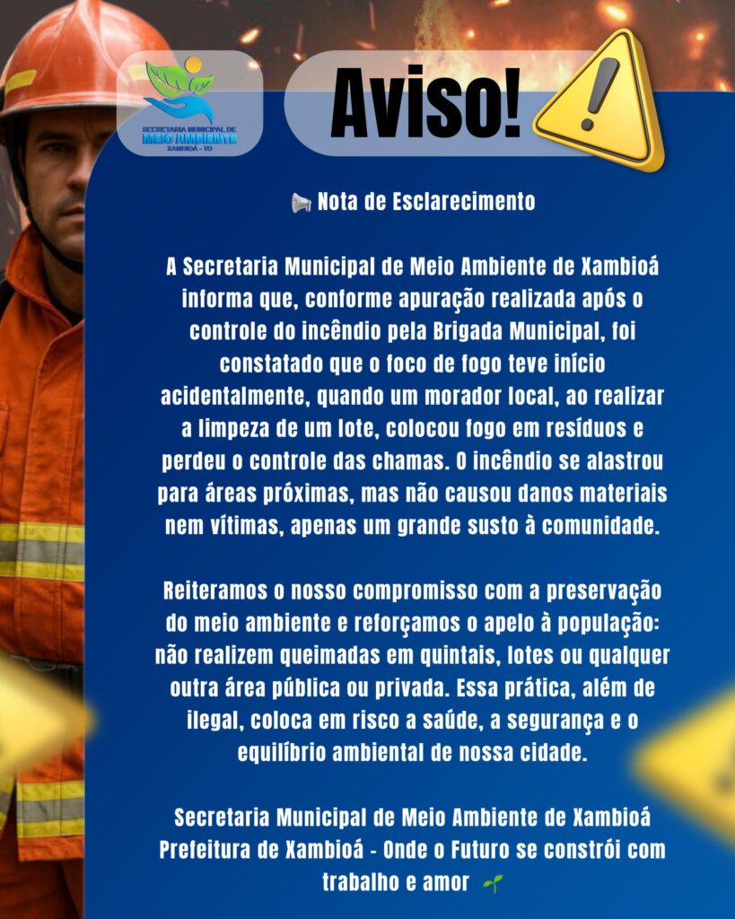 A Prefeitura de Xambioá emitiu nota de esclarecimento neste sábado ,20, em que retifica informações sobre o incêndio registrado em área urbana, na última sexta-feira, 19, informando que, conforme apuração da Secretaria Municipal de Meio Ambiente, o foco teve início de forma acidental quando um morador realizava limpeza de um lote e colocou fogo em resíduos, perdendo o controle das chamas. A ocorrência foi debelada pela Brigada Municipal, segundo o comunicado.