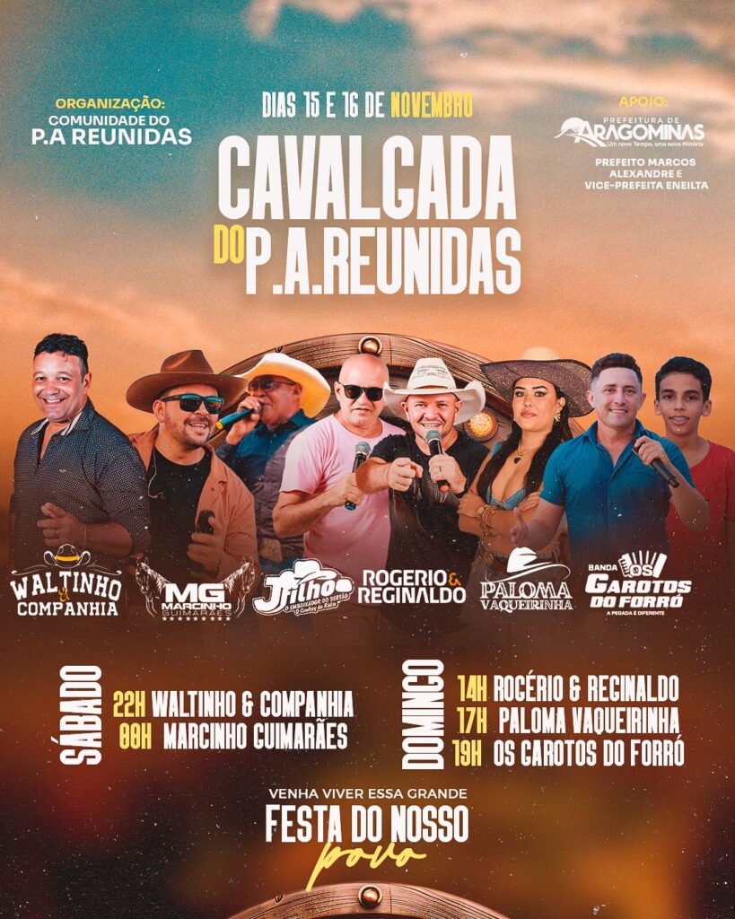 Nos dias 15 e 16 de novembro, a Cavalgada “P.A Reunidas” traz música, dança e a força da comunidade em Aragominás, com shows de artistas locais e a participação do prefeito Marcos Alexandre e da vice-prefeita Eneilta.