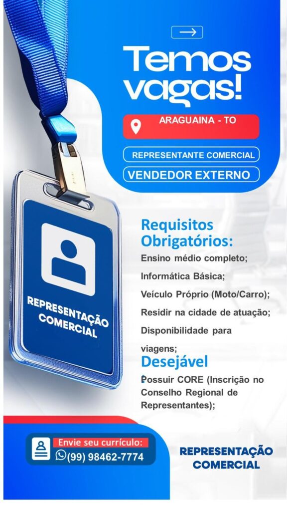 Uma empresa do setor de representação comercial anunciou a disponibilidade de vagas para o cargo de Representante Comercial (Vendedor Externo) na cidade de Araguaína, Tocantins. Os candidatos devem atender a uma série de requisitos obrigatórios para se qualificarem para a posição.