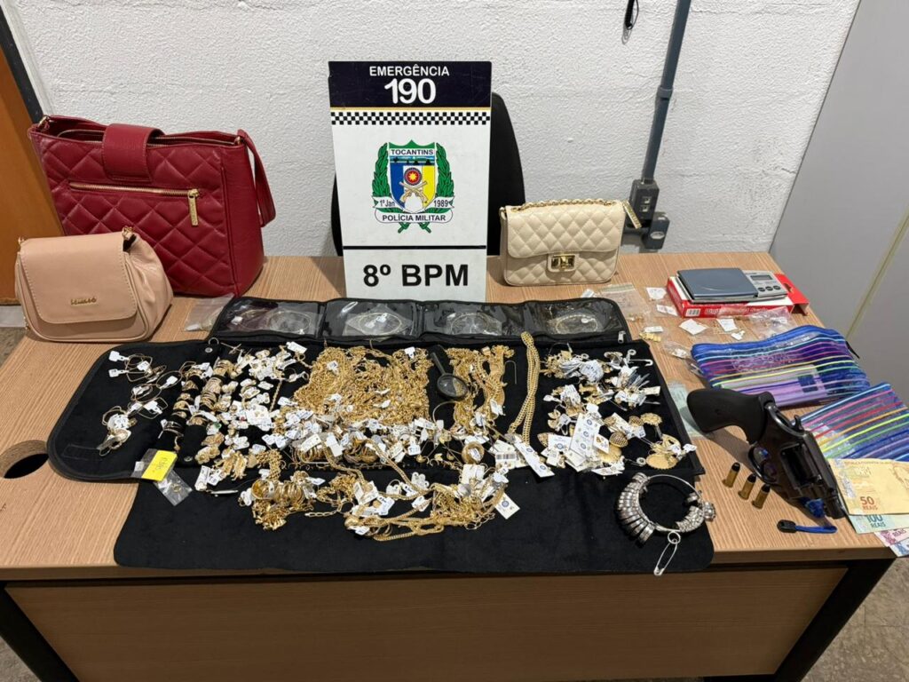 A Polícia Militar do Tocantins, por meio do 8º Batalhão, realizou a prisão de um homem de 20 anos e uma mulher de 27 anos na tarde desta quinta-feira, 19 de fevereiro, em Caseara. A ação resultou na recuperação de um carregamento de joias e artigos de luxo avaliados em aproximadamente R$ 550.000,00, que haviam sido roubados no estado do Pará.