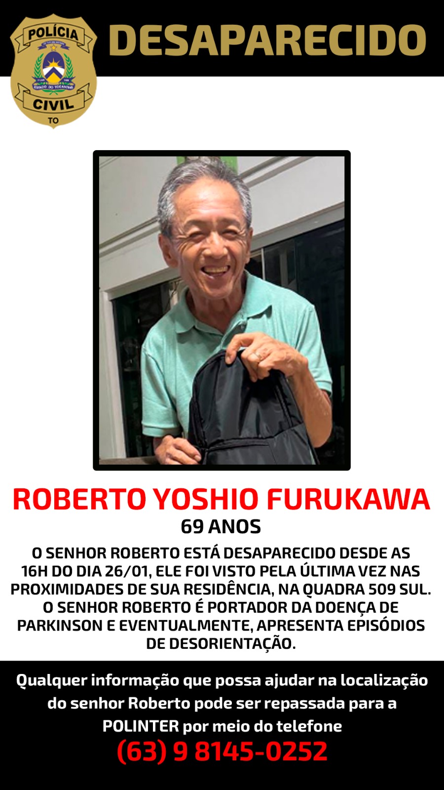 Roberto Yoshio Furukawa está desaparecido e a comunidade é convocada a ajudar nas buscas. A Secretaria da Segurança Pública do Tocantins iniciou diligências para localizar ...